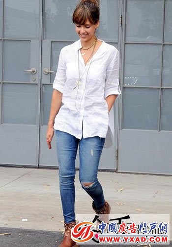 其实白衬衫真的是你必不可少的百搭单品啦,一件简约的白衬衫,搭配一条破洞的牛仔紧身长裤,非常的休闲舒适哦,无论是夏末还是初秋, 都是你的最佳选择啦!