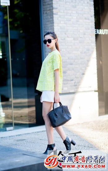 荧光绿色的格子上衣,宽松的款式,很有欧美的大腕范儿,搭配白色的短裤,以及手提的黑色包包,时尚靓丽不可代替。圆形的复古墨镜,更是将造型发挥到极致。