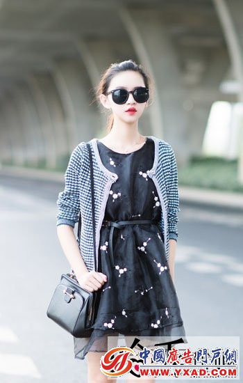 黑色丝滑质地的连衣裙,裙子上面拥有一层网纱的修饰,并且还有零星小图案的点缀,体现出你优雅干练的气质。加上一件灰色的格子开衫,十足的秋天搭配。