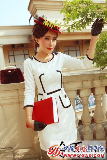 复古款式的白色紧身连衣裙,裙子很欧美的风格,紧致的造型,很有范儿。搭配手拿的红色书本式的手拿包,时尚艳丽。