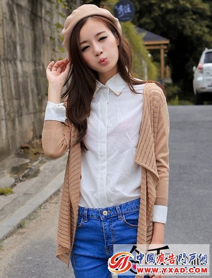 白色的衬衫搭配时尚百搭的牛仔裤,很简单整洁的秋季服饰。再搭配上一款不规则下摆的棕色开衫,还有可爱的小洋帽做为修饰,干练的搭配,甜美的气质,依旧很吸引人。