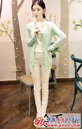 一件白色的打底背心,搭配一件糖果绿的薄外套,非常的休闲好看哦,下半身再搭配一条高腰的波点白色长裤,让你瞬间拉长了腿部的曲线,显高又显瘦啦!
