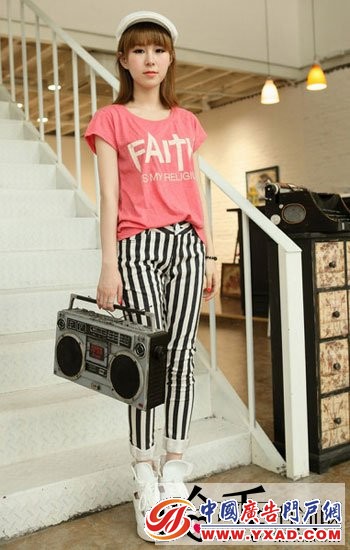 美美的粉红色字母t恤,让你看起来更加的可爱动人哦,简单搭配一条黑白竖纹的复古长裤,三种颜色的巧妙碰撞,更为你增添动人的气息呢!