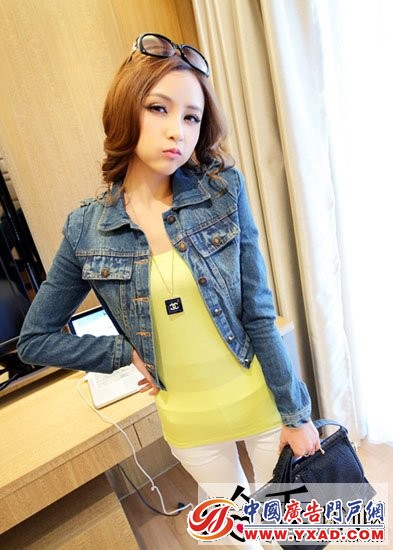 经典的牛仔浅蓝色的这款修身的牛仔外套,衣服精致的线条设计,简约的款式,搭配一件黄色的背心作为打底,时尚潮气。