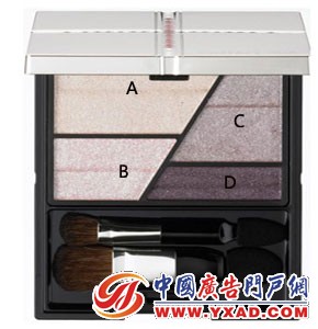 打造方法:用A在整个眼皮大面积涂抹,遮盖眼部暗沉;接着用C涂抹在双眼皮折痕的范围内,由睫毛根部向上少量多次涂抹,使颜色均匀;第三步,用D勾勒外眼线,制造出眼睛的轮廓,并在外眼角三分之一的位置晕染,形成层次感;最后,用B在眉骨处提亮,注意要晕染与眼皮颜色的界限处,避免色块感。
