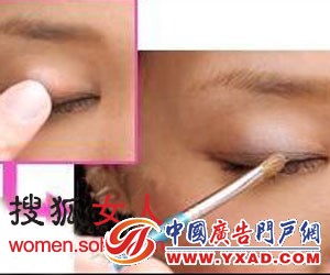 用指腹取浅棕色的眼影涂抹在眼皮上方之后,取银灰色的眼影于小号的刷子上刷在眼皮处。