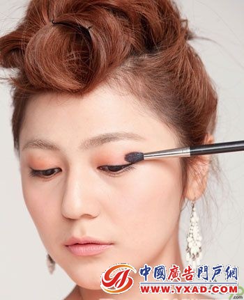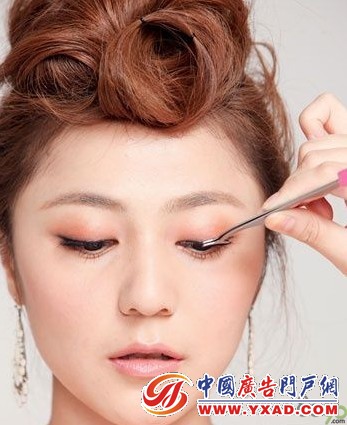 接下来描绘眼线,用手指轻轻拨起上眼皮,贴合睫毛根处,由眼头的位置开始顺畅的画到眼尾之处,到眼尾处可以轻轻上扬带过一点小尾巴出来,拉长眼睛。描画好上眼睑眼线后夹卷睫毛,粘贴自然感的假睫毛,再涂抹睫毛膏,纵向扩大眼睛。