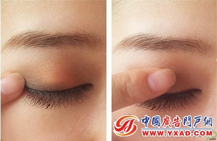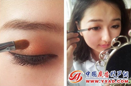 STEP 2:接着在原有的浅棕色眼影的基础上,在上眼睑贴近睫毛根部和下眼睑近外眼角三分之一处加涂橘色眼影,在夏天推荐选用热情的橘黄色系,能使你看起来更自信,更有活力。而且橘黄色更有夏天的味道哦!
