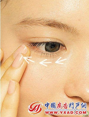 2.用手指沿剪头方向轻轻将遮瑕膏拍开后,再轻微涂抹,使遮瑕膏更加均匀、服帖。