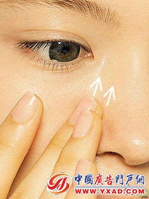 用手指蘸取少量遮瑕膏,从下至上轻轻涂抹。
