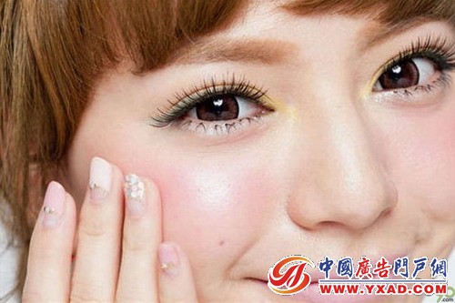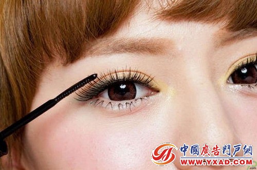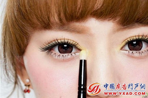 从眼头往瞳孔正上方的位置画上鲜黄色的眼影,如果担心黄色眼影会不够显色的人,可以先叠擦一层金色或黄色霜状眼影来打底。