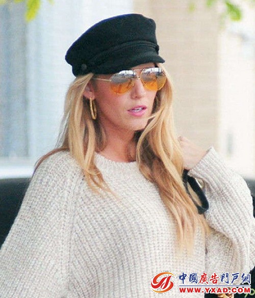 戴了浅色透明片墨镜和硬朗檐帽出街的Blake,气场越来越大牌。搭配粉橙色系的柔和妆容,配件虽多却不觉得突兀,帅气之余多了一些女人味。