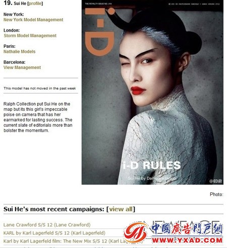 近日,世界权威机构公布了最新一期全球模特排名。在这份榜单上,中国模特依旧延续着强势表现,在女模Top50中就占据了7席,堪称最大赢家。刘雯依旧是排名最高的中国模特,稳居第六。全球领先的模特教育机构——新面孔模特学校包揽了此次入榜中国模特的大多数,包括何穗、赵磊、张丽娜等多位超模均榜上有名。上升势头最猛的当属新面孔模特教育培养的超模何穗,跻身Top50的前20。何穗凭借着近两年稳定而出色的表现赢得了一致肯定,在某专业网站发起的“谁将成为下一位进入Top10的中国超模”的调查中,何穗的得票率遥遥领先,看来进入TOP10只是时间问题。