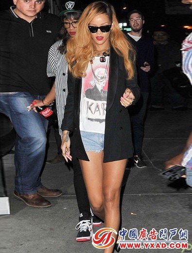 小天后蕾哈娜总是能将中性风穿出性感的一面。就好比这件男朋友风格的西装外套搭配图案T恤后,加上一条超短热裤与尖头鞋,用帅气与女人味混搭在一起。