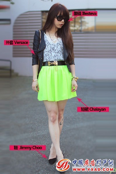 蕾丝上衣加上亮色调的荧光裙,信手捏来的尖头小黑鞋让整体造型更加活泼。