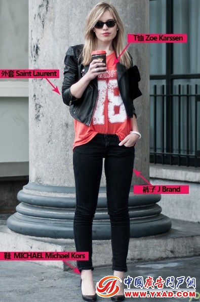 裤装和尖头鞋的搭配堪称经典,上衣变成很舒适的T恤让整体造型变得轻松休闲的多。
