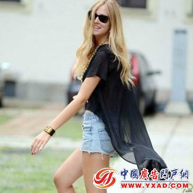 修身的牛仔短裤搭配黑色透视衬衫,不过这款衬衫非常有个性呢。燕尾的衣摆设计十分巧妙,与很简单的短裤搭配起来,瞬间有种高街气场范儿。