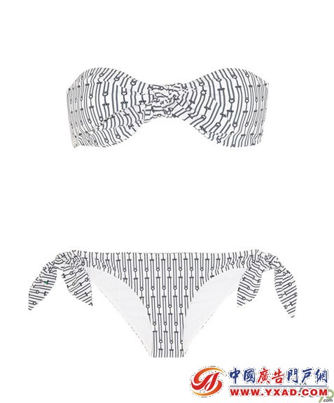 抹胸型比基尼,清新蓝白色马嚼子图案,出行时外面套一件白色或者透明衬衣,再穿一双金色拖鞋,你就可以美丽横行!