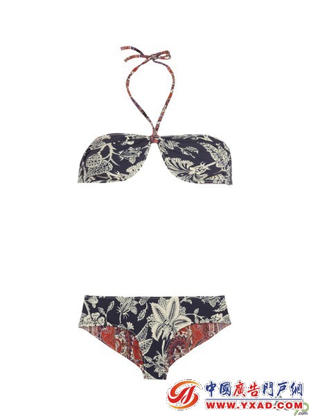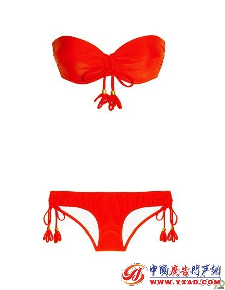 在比基尼上想要挑战红色,最好起用猩红色。这件泳衣的亮点是中间的褶皱部分和绳子上的金色箍圈。这一身最适合搭配一顶宽边软帽和蝴蝶形太阳眼镜。