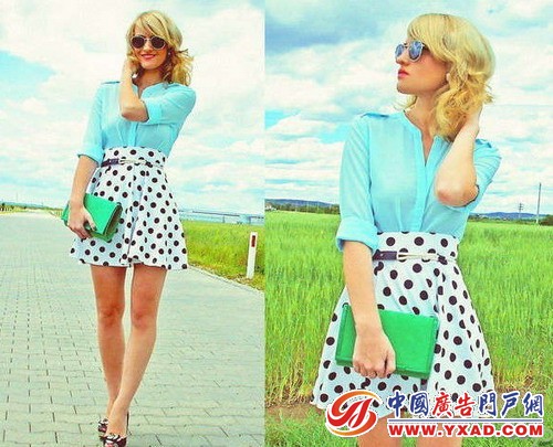清新、自然的湖蓝色衬衣一展女性成熟风貌,再以经典的白底黑色波点半身裙搭配。玲珑腰线被勾勒的极为曼妙,同时也将休闲、惬意的假日风情表现的恰如其分。