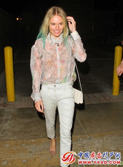凯特·波茨沃斯晚间出行选择透视印花衬衫搭配窄腿裤,优美的花纹加上极轻薄的材质,夏天穿着绝对能感受到一丝凉意。简单搭配白色小挎包和裸色高跟鞋。不论是晚宴还是出去游玩都很适宜。