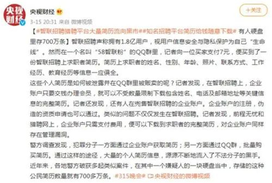 “7元即可购买一份完整的个人简历”。智联招聘、前程无忧、猎聘网等招聘平台上的个人简历泄露,企业只要办理会员,即可无上限下载平台的用户个人简历。伪造的资质也可通过平台的认证,企业账户管理存在严重漏洞。