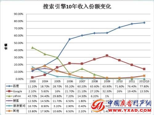 注:营收份额取自艾瑞数据,根据上市公司财报计算因此相对准确。与实际市场份额,用户占有率有出入,如2012年Q3季度360的用户占有率据统计已达10%。但在搜索引擎商业模式相似的情况下,收入情况可以代表市场占有情况。