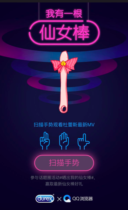 QQ浏览器和杜蕾斯的跨界营销活动,通过巧妙的将QQ浏览器的AR"黑科技"下拉扫一扫功能与杜蕾斯的情趣产品深度绑定,同时借助双方在话题互动领域的优势,最终将营销效果和创造的商业价值提升到了全新的高度。据了解,基于AR技术的“下拉扫一扫”功能是此次营销中用户参与的第一步,其改变了用户被动接受营销活动信息的方式,取而代之的是用好玩有趣的互动方式让用户主动参与;其次,QQ浏览器基于腾讯浏览服务(TBS)的WebAR能力,全面支持用户从QQ浏览器分享活动到微信和手机QQ等社交平台,完美满足了用户的社交心理需求,此次活动共吸引了近130万人参与。