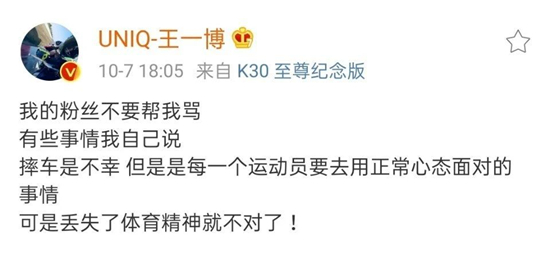 10月7日.珠海ZIC摩托车赛 珠海ZIC摩托车比赛上,A组比赛中,王一博驾驶的85赛车和胡通明驾驶的18赛车发生碰撞事故,被迫中止比赛。 王一博摔车后杜卡迪车队欢呼、疑似胡通明与队友击拳庆祝、赛手微信群聊天记录曝光...负面舆论持续发酵。 杜卡迪车队欢呼 疑似胡通明与队友击拳庆祝 赛手微信群聊天记录 10月7日.王一博发文回应摔车 10月7日.杜卡迪中国微博回应 10月7日.杜卡迪公众号回应 10月7日.珠海市汽车摩托车运动协会会赛赛事仲裁 关于ZIC摩托车赛 A组比赛中,85赛车和18赛车的碰撞事故,认定为比赛事故,所有成绩保持。 10月9日.赛手胡通明发文回应摔车事件