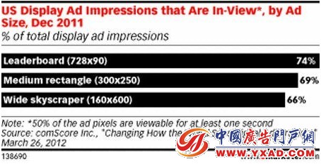 显示广告体积的大小,似乎也是影响广告能否频繁被网民观看的因素之一。comScore发现,体积为728x90像素、出现在页面顶部的显示广告,能够被网民观看的比率也最高,达74%。中等长方形广告的相应比率为69%,而占满页面的竖条式广告的比率最低(66%),原因是用户在观看此类广告时,经常需滚动鼠标,才能观看到广告的全部内容。