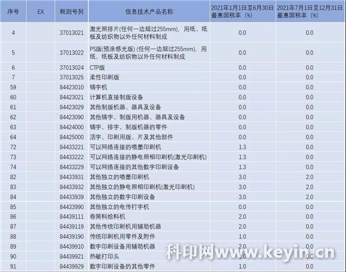 综上,在《部分信息技术产品最惠国税率表》中,除“其他独立的喷墨印刷机”“其他独立的静电照相印刷机(激光印刷机)”“其他独立的数字印刷设备”等数字印刷设备类产品外,其余与印刷设备与器材相关的产品全部在2021年的下半年实现零关税。