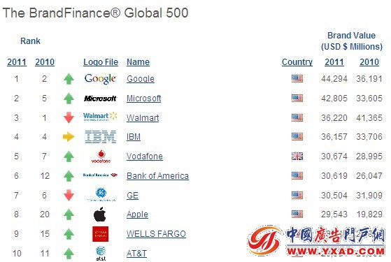 【TechWeb报道】3月25日消息,据国外媒体报道,国际品牌评估机构BrandFinance公布了2011年全球品牌价值500强名单,其中谷歌排名第一,较去年上升一位,品牌价值443亿美元。市值1430亿美元,低于去年的1579.7亿美元。