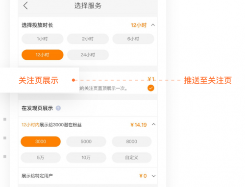 ② 粉丝头条:通过粉丝定向和多标签定向定位,精确获取高价值粉丝,同时支持同城页曝光,LBS获取本地精准流量。为指定视频作品购买粉丝头条服务后,该作品将在24小时内在粉丝关注页内置顶一次,同时也可以选择在非粉丝用户的发现页或同城页展示。根据实际粉丝数量或曝光量进行计价。非企用户可以选择粉丝头条进行个人形式的宣传。