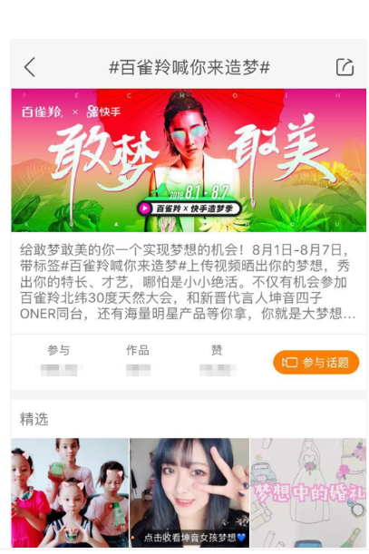 ③ 话题标签页:快手社交平台具备聚合粉丝、运营粉丝的天然属性,快手老铁生态特有的温度、信任度和忠诚度,也使得在快手社交平台传递品牌信息,开展粉丝互动更容易。快手“话题标签”产品凭借高社交互动性和完整的整合传播方式让用户从围观到参与,通过拍摄标签相关短视频,自发成为品牌传播的一环,进而帮品牌打造口碑,俘获更多的用户。通过“话题标签”方式成功开展的营销活动,能够充分释放品牌的用户号召力。