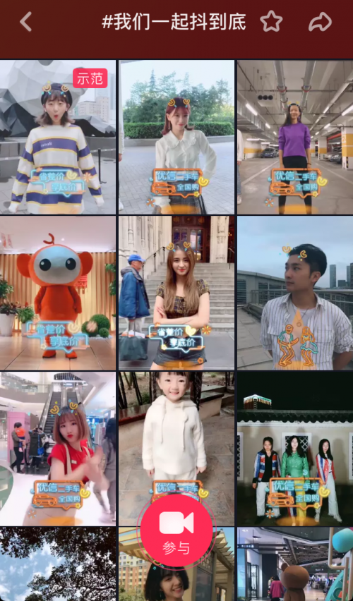优信二手车全国购在品牌slogan换新之际,瞄准年轻用户群体,带来#我们一起抖到底#抖音挑战赛,将品牌亮点、特色与抖音创意营销玩法深度结合,和用户一起“抖”出精彩,把品牌理念以多样化、趣味性的方式传递给用户。