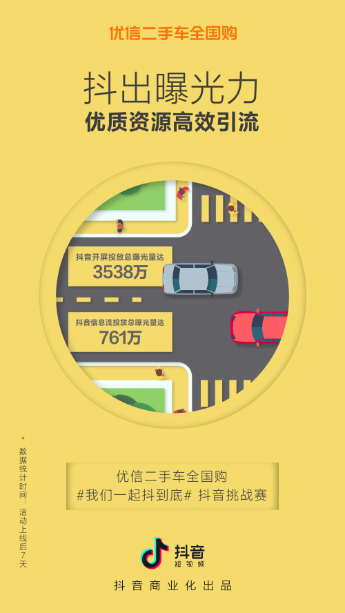 近日,优信二手车全国购就选择牵手短视频领域的深耕者——抖音短视频,带来一场契合年轻人口味的短视频营销,通过发起#我们一起抖到底#抖音挑战赛,收获了总播放量超9.4亿、点赞与评论量超3203万的成绩,品牌与希望触达的年轻用户间完成了高效互联。
