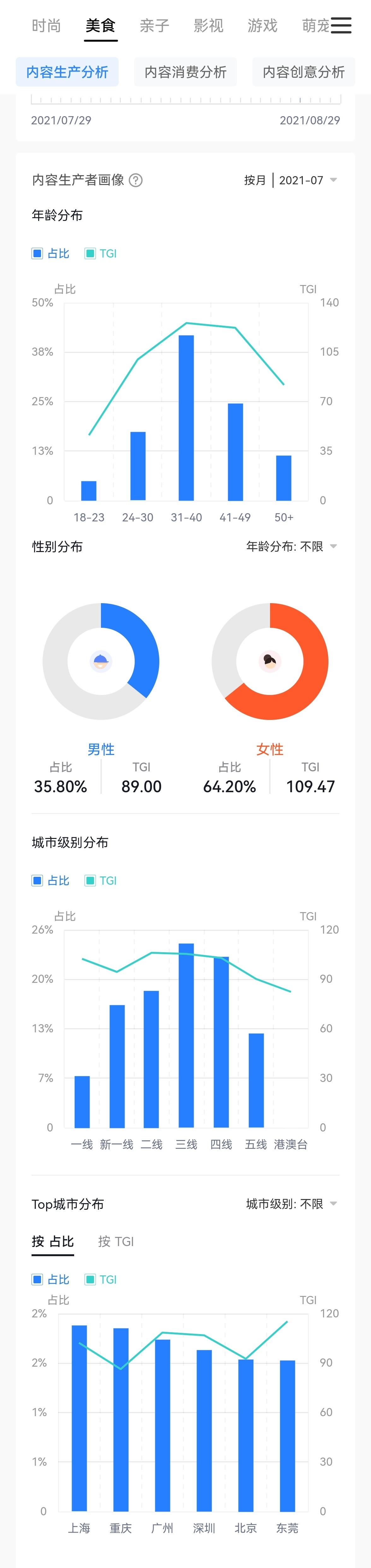同时,创作者可以通过消费者人群画像(包括年龄、性别、城市分布情况)了解内容观看人群和内容互动人群的特征,从中寻找内容创作机会点。