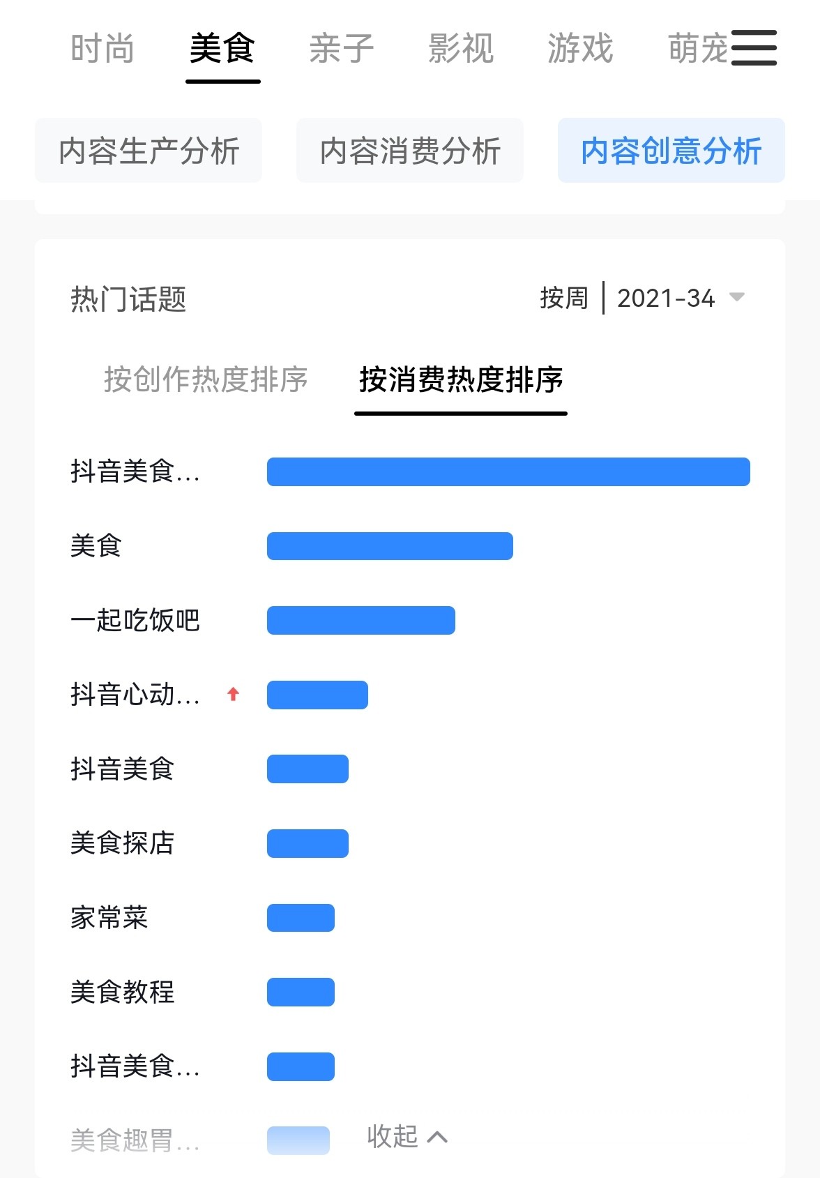 为解决垂类创作者的这些痛点,近期,巨量算数移动端在原有功能基础上新增“抖音垂类分析”板块,深挖时尚、美食、亲子、影视、游戏、萌宠、二次元七大垂类领域数据洞察、最热内容,通过内容生产、内容消费、内容创意三大核心功能,让广大内容创作者、营销从业者及品牌主可以更加便利、及时地主洞悉领域机会,激发优质内容新可能。