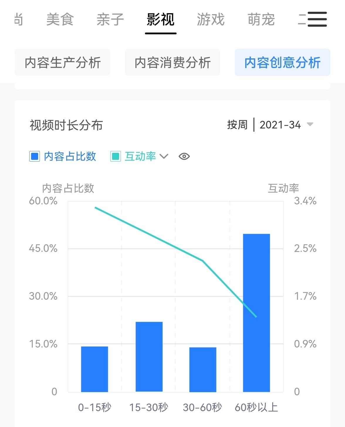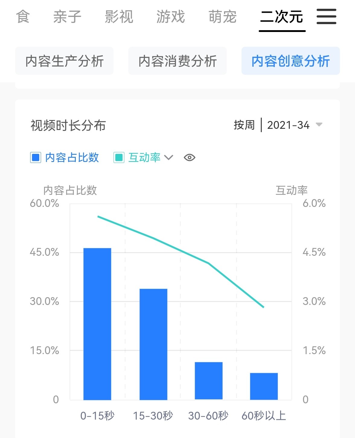 此外,各垂类创作者还可借助视频时长分布功能,获得视频参考时长,有效提升内容互动率。例如,二次元垂类0-15秒内容占比&互动率最高,而影视垂类垂类60秒以上内容占比&互动率最高。