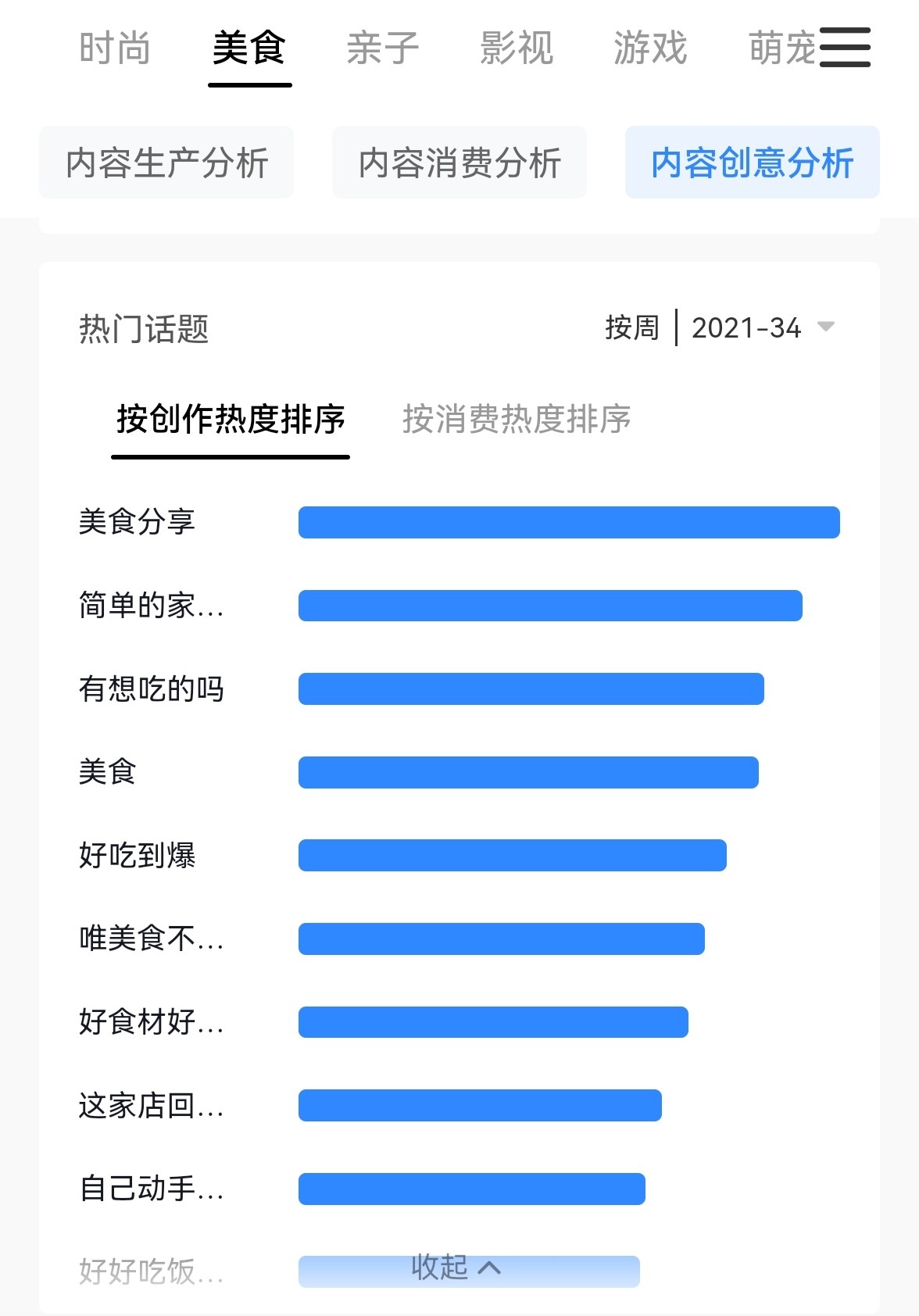 在内容创意分析页面,创作者可以看到某一时期某一关键词的热门视频、内容时长占比数、互动率图表以及热门话题。据此,创作者可在视频及文案中添加垂类热词,还可参考热度Top视频创意内容,从而提升自产视频热度。而垂类行业的热门话题,更能帮助创作者做到“心中有数”,轻松找到内容创意方向。
