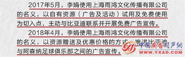 事件的真相现在还无从知晓,是非曲直自有法律伸张正义,如果的确如比亚迪澄清公告中所说的那样,有“李娟曾使用上海雨鸿文化传播有限公司的名义,以资源赠送及优惠价格的方式,推进比亚迪与阿森纳足球倶乐部之间的广告宣传”这样事情,法律自会还这些遭受巨大损失的供应商们和“被蒙蔽”的比亚迪以公道。